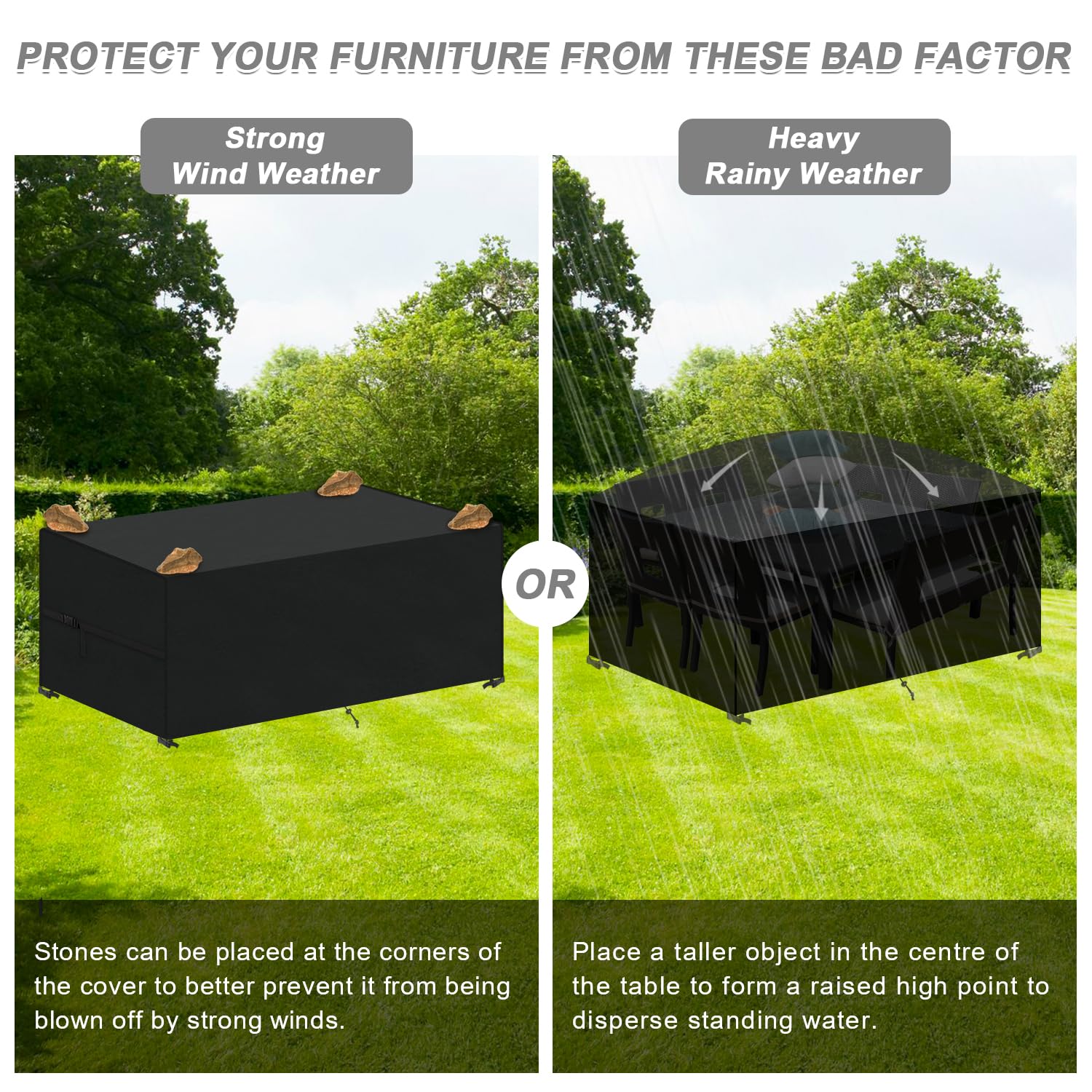 - 【Wasserdichte Anti-UV Abdeckhauben】LAMUNI Gartentischabdeckungen sind mit verdickter PU-Beschichtung beschichtet, dieses UV-beständige Design kann außergewöhnlichen Schutz unter dem Sonnenlicht bieten; Extra wasserdichtes Klebeband ist speziell auf den oberen Nähten hinzugefügt, um das Eindringen von Regenwasser zu verhindern. Das Ganzjahresdesign bietet einen umfassenden Schutz für Ihre Möbel und Kissen vor Kratzern, Staub, Feuchtigkeit, Rost, Fäulnis und Schimmel.