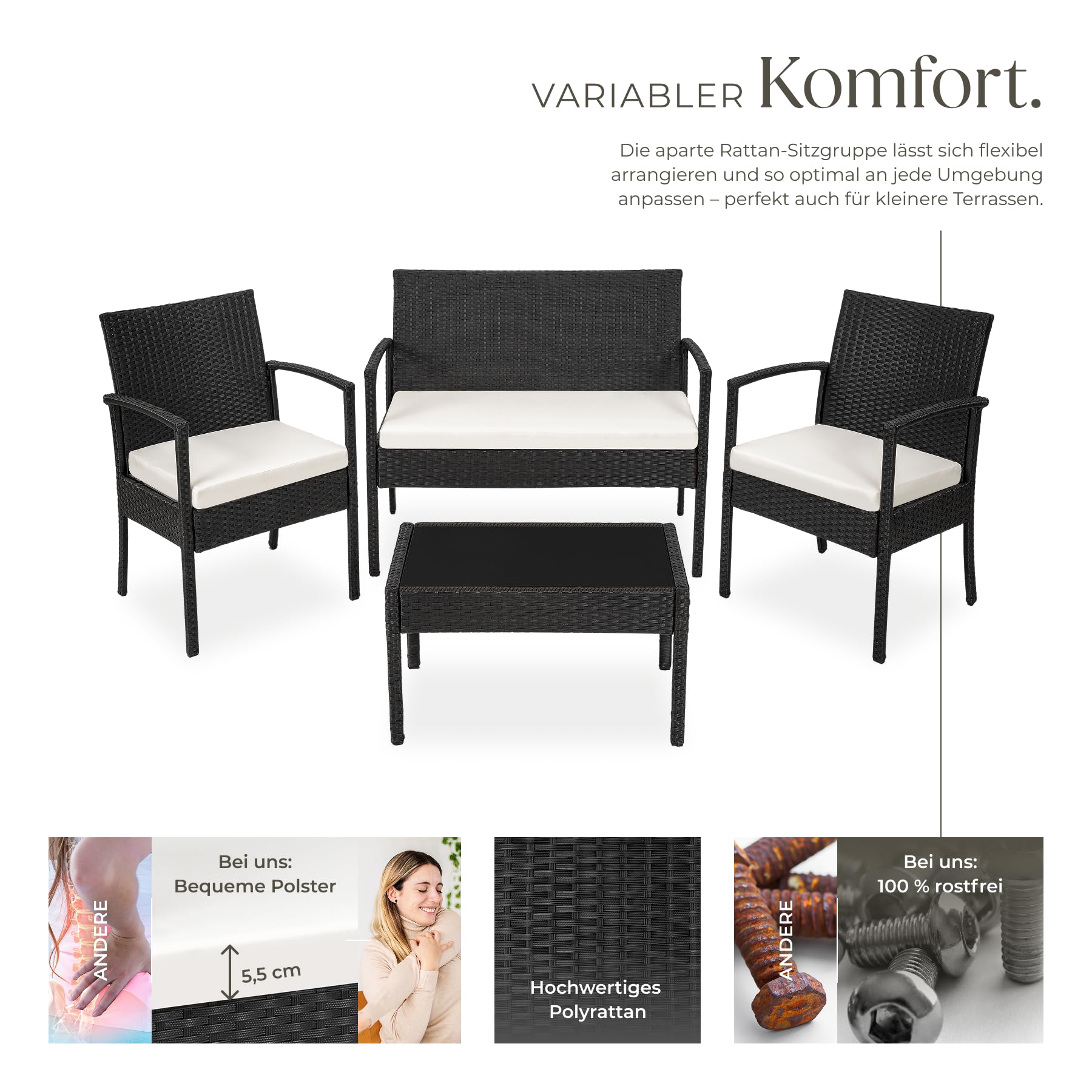 tectake Rattan Gartenlounge 4-tlg., 2 Sessel, Bank & Tisch, Outdoor schwarz