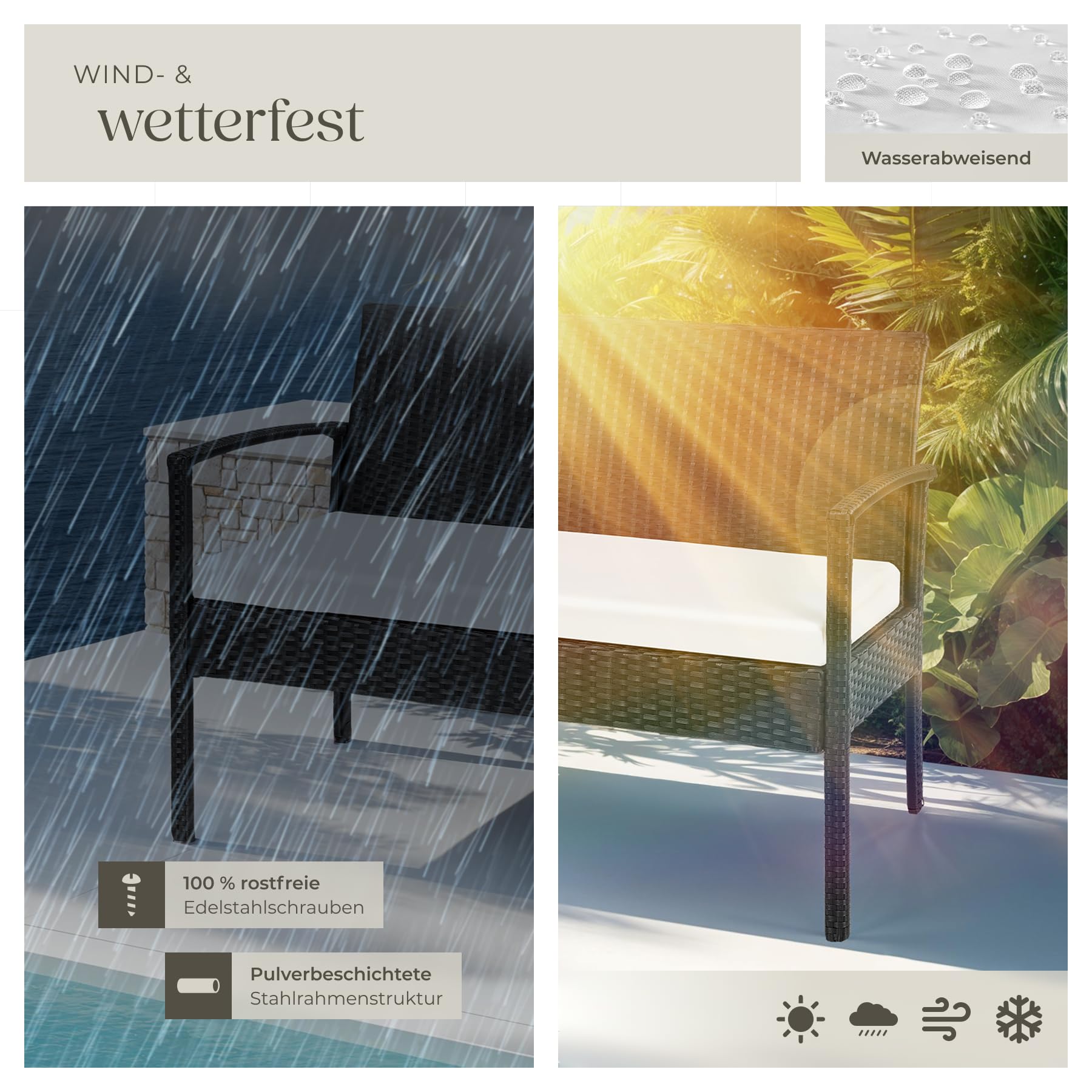 • LANGLEBIG & PFLEGELEICHT: Gefertigt aus Polyrattan, verspricht diese Balkon Lounge mit Sofa Tisch Langlebigkeit und einfache Pflege. Ein langlebiges Balkon Möbel Set für Deinen Außenbereich.