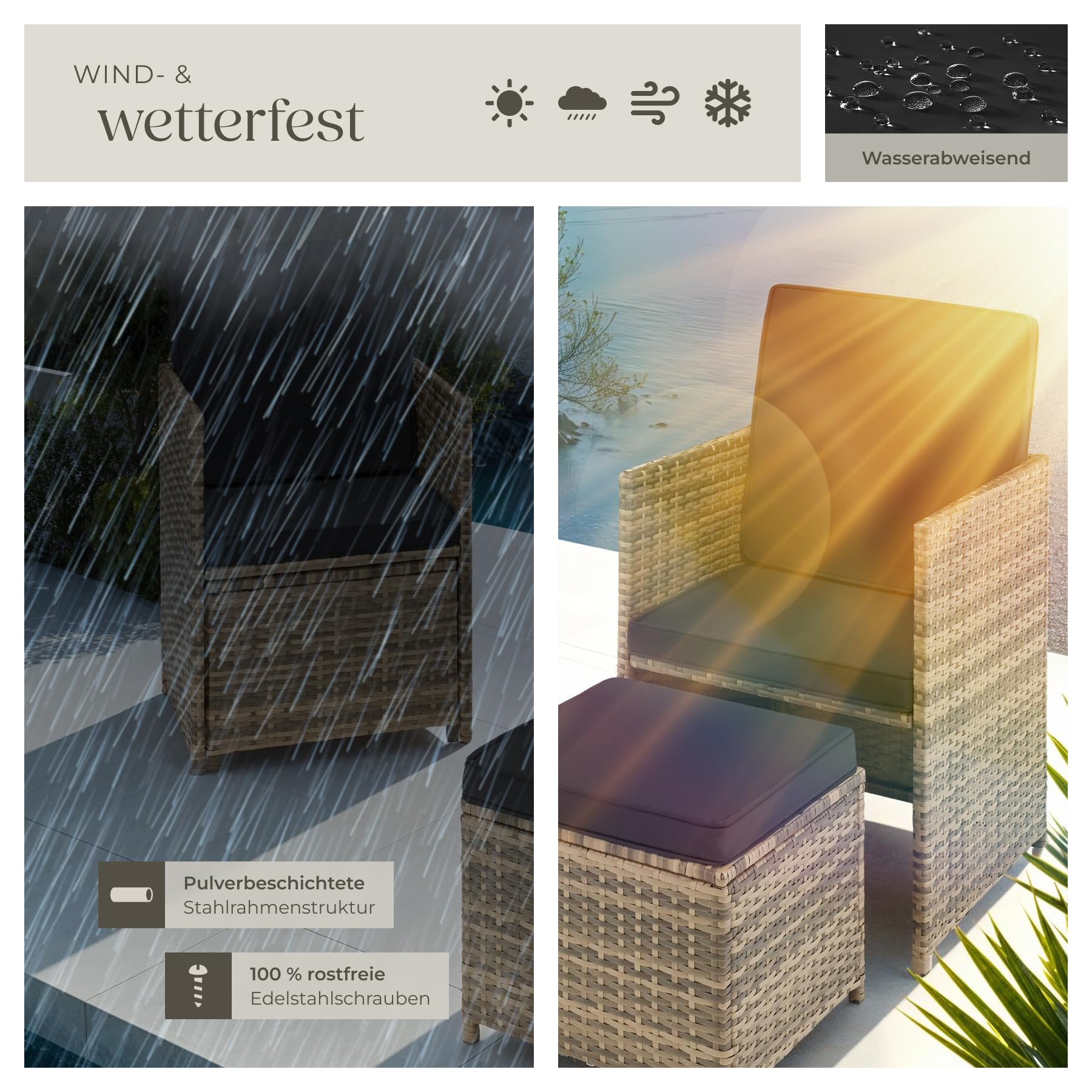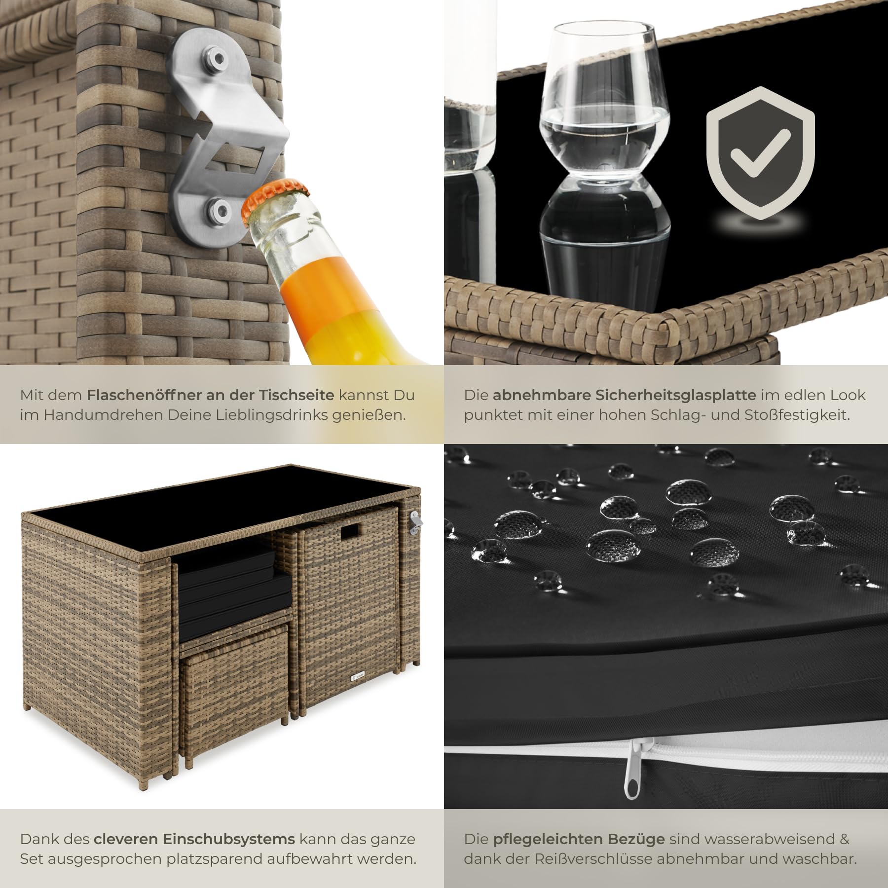 - PFLEGELEICHT UND PFIFFIG: Das Tisch mit 4 Stühlen Set hat durch die wasser- und schmutzabweisenden Eigenschaften einen geringen Reinigungsaufwand. So kann man die abnehmbare Glasplatte Tisch und die leicht zu wechselnden Bezüge der Balkon Sessel ganz einfach säubern. Außerdem ist das Set samt Gartentisch wetterfest, lässt sich nach Benutzung schnell und platzsparend verstauen und nimmt so nicht mehr Platz ein, als ein Sofa.